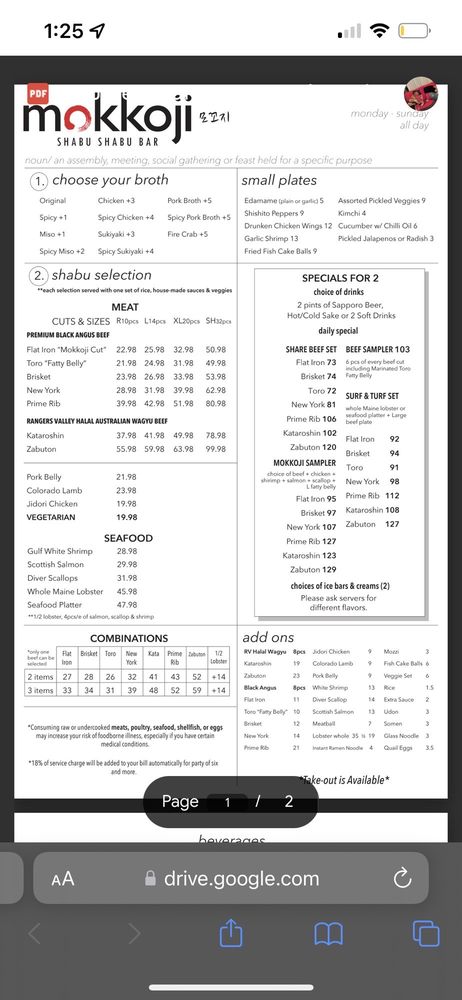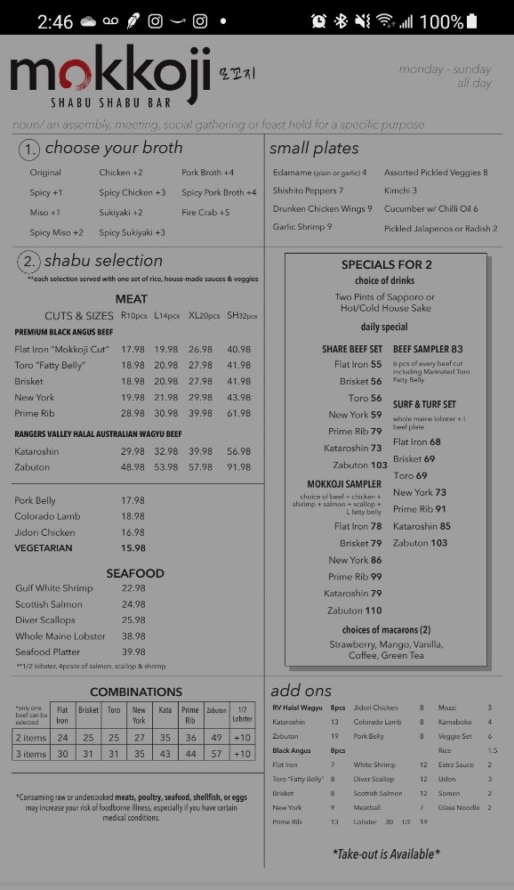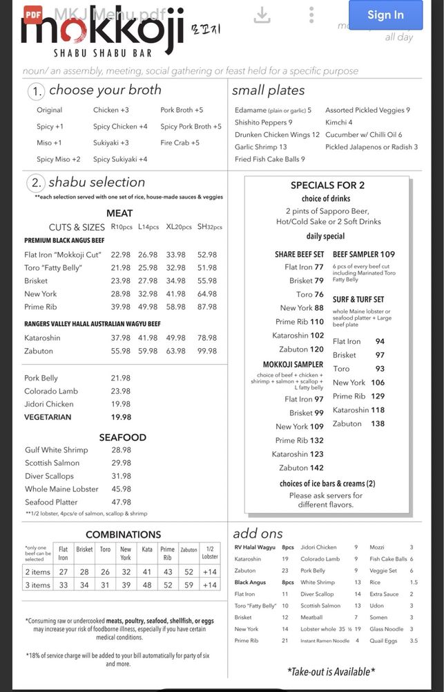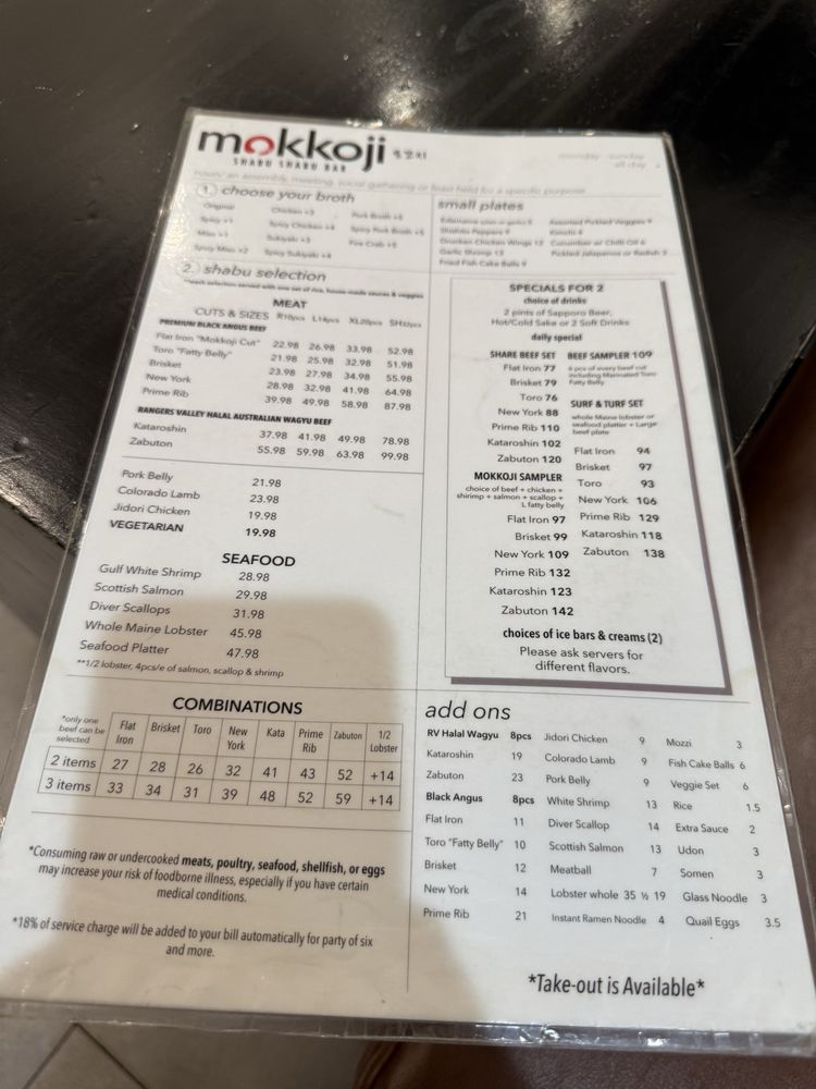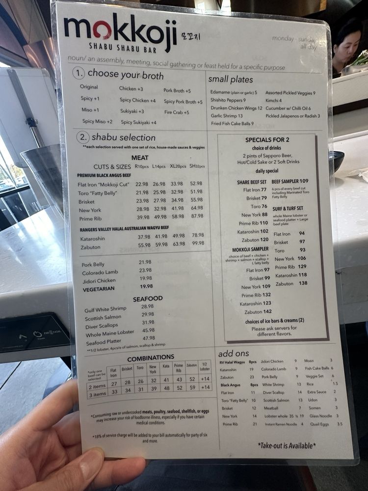 Introducing the menu at Mokkoji Shabu Shabu, a trendy Japanese restaurant located in Costa Mesa, CA. This Asian-owned eatery offers a variety of options suitable for vegans and vegetarians, with wheelchair accessibility and a gender-neutral restroom. The menu features classic Shabu Shabu dishes perfect for brunch, lunch, or dinner, with options for delivery and takeout. Guests can enjoy waiter service in a loud, bustling atmosphere, with the convenience of QR code menus and various payment methods accepted, including cryptocurrency. The outdoor seating area is heated, making it a great spot for large groups or private dining. Overall, Mokkoji Shabu Shabu provides a unique dining experience with a focus on inclusivity and delicious Japanese cuisine.
